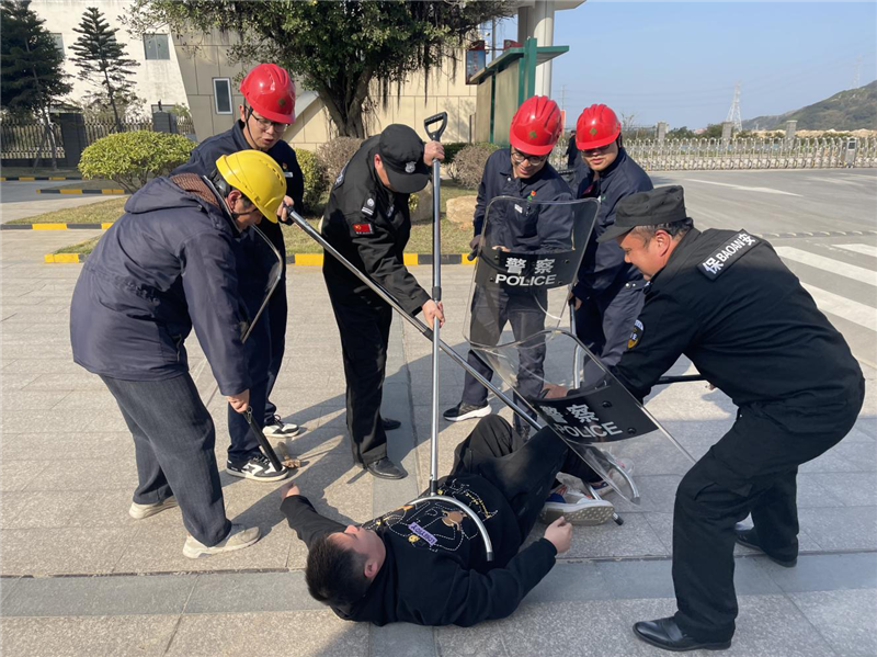 在隨后的反恐防暴演練中,工作人員扮演“入庫歹徒”突然沖進庫區(qū)。保安發(fā)現(xiàn)情況不對,立即報警,庫內(nèi)員工立刻啟動反恐防暴應(yīng)急演練預(yù)案,迅速拿起鋼叉、盾牌、警棍等防護器械進行防御,奮力阻止“可疑人員”的行兇。