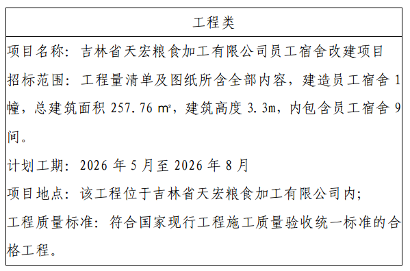 一、項目名稱:吉林省天宏糧食加工有限公司員工宿舍改建項目