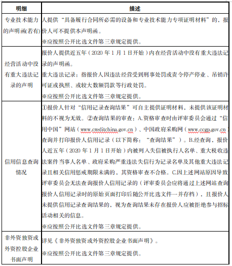 ?。ㄎ澹﹫?bào)價(jià)人必須滿足本公開(kāi)比選文件所述對(duì)應(yīng)的所有資格條件,有任何一條不滿足,都將導(dǎo)致其公開(kāi)比選響應(yīng)文件按無(wú)效處理。所有資格證明文件應(yīng)是最新、有效、完整、清晰。有變更事宜的,變更文件應(yīng)附齊全,否則按無(wú)效處理。