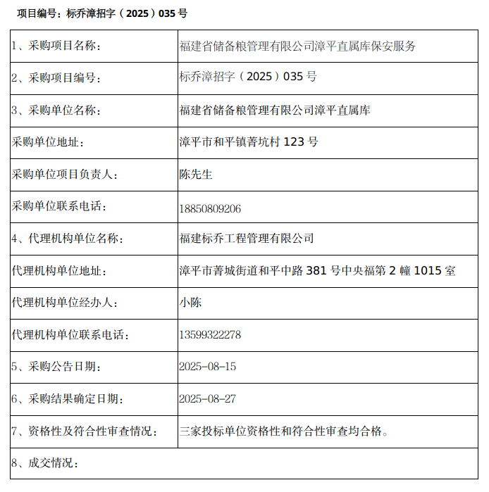 福建省儲(chǔ)備糧管理有限公司漳平直屬庫保安服務(wù)采購服務(wù)成交結(jié)果公告