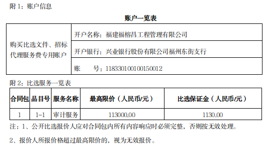 (二)獲取地點(diǎn)及方式:1、直接至我司辦理(現(xiàn)場(chǎng)報(bào)名地址:福州市晉安區(qū)世紀(jì)城3號(hào)樓地面1層103室)。2、異地購(gòu)買(mǎi)采購(gòu)文件者,將購(gòu)買(mǎi)公開(kāi)比選文件款匯到本公司賬戶(hù),同時(shí)將電匯底單復(fù)印件及《領(lǐng)取招標(biāo)文件登記表》(格式詳見(jiàn)采購(gòu)公告附件)寫(xiě)明后將掃描件發(fā)至(18350055651@163.com),未及時(shí)將上述報(bào)名須提供的材料發(fā)送至我公司所引起的一切后果由報(bào)價(jià)人自行承擔(dān)。本招標(biāo)代理公司不對(duì)郵寄過(guò)程中可能發(fā)生的延誤或丟失負(fù)責(zé)。