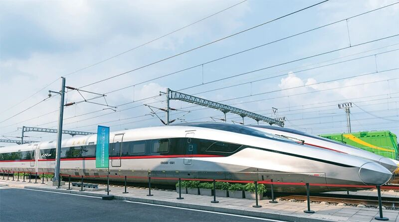 “十四五”時期,以CR450動車組為代表的一項項重大技術裝備項目取得新進展、實現(xiàn)新突破。CR450動車組試驗速度可達450公里/小時,運營速度可達400公里/小時,是全球跑得最快的高鐵。圖為2025年7月9日,在國家鐵道試驗中心展區(qū)拍攝的CR450BF動車組。 新華社記者 才揚/攝